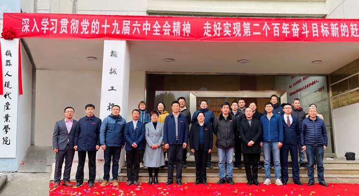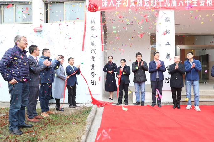 在师生热烈的掌声中,校领导、学院代表与企业代表共同为机器人现代产业学院揭牌。(文/沈智 图/潘旭、宋佳雪)
