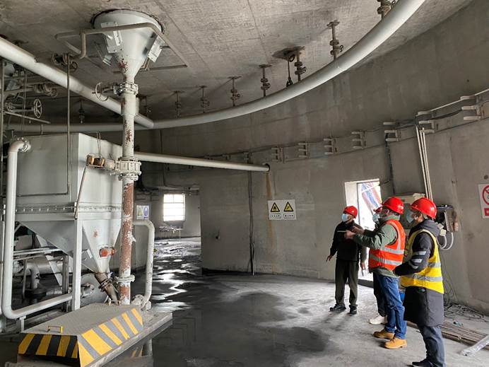 公司现场负责人徐辉热情接待了调研组一行,并带领大家参观了粉煤灰灰库清理现场。技术人员详细介绍了该公司在针对灰库板结积灰清理方面目前主要采取的办法以及存在的困难,调研团队针对该问题提出机械化解决方案,并针对方案技术细节与一线工作人员深入探讨,研究其技术可行性。
