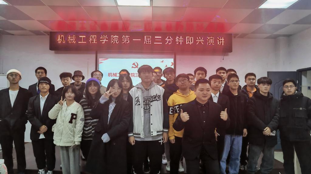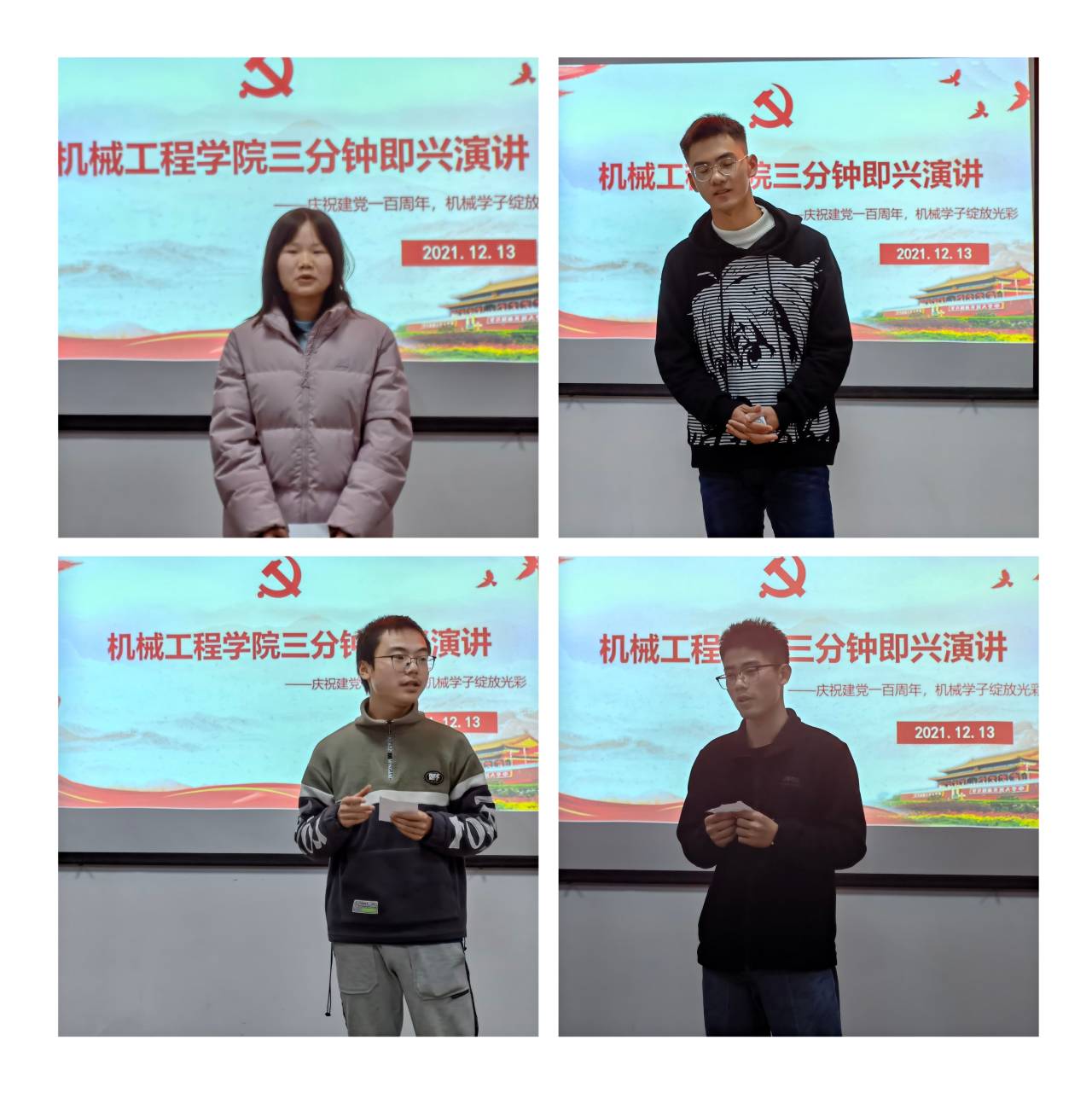 12月14日,机械工程学院在机电楼A304会议室举办了以“庆祝建党一百周年,机械学子绽放光彩”为主题第一届“三分钟即兴演讲”比赛。各班级选手、团委、学生会各部门代表、老师评委共43人参加。
