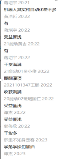 21能动01胡添睿:今晚我听了来自往届能动专业优秀学长给我们解答的关于能动专业的一些问题,感觉收获很大,了解到了能源与动力工程专业就业前景上是非常不错的,而且近年来我们专业的考研率算是很高的水平,更多是感受到了学习上的动力!