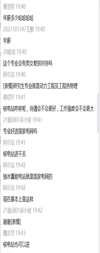 针对部分在校同学有“迷茫”、“躺平”心态,诸位校友用各种详实的数据和具体生动的事例一一释疑,赢得了同学们的由衷信服。“倒班如何?”“真的是传说中烧锅炉?”“就业环境和生活保障如何?”“研究生和本科差别大不大?”“抽蓄如何备考?”等等,聊天区同学们积极提问发言,校友们逐一细心回复,现场气氛融洽、亲切、温馨。在这个特别的节日里,能动青年们的理想信念之光再一次被点燃。