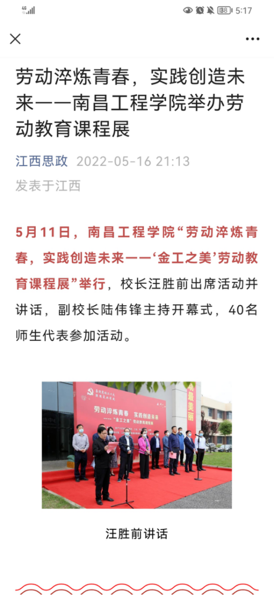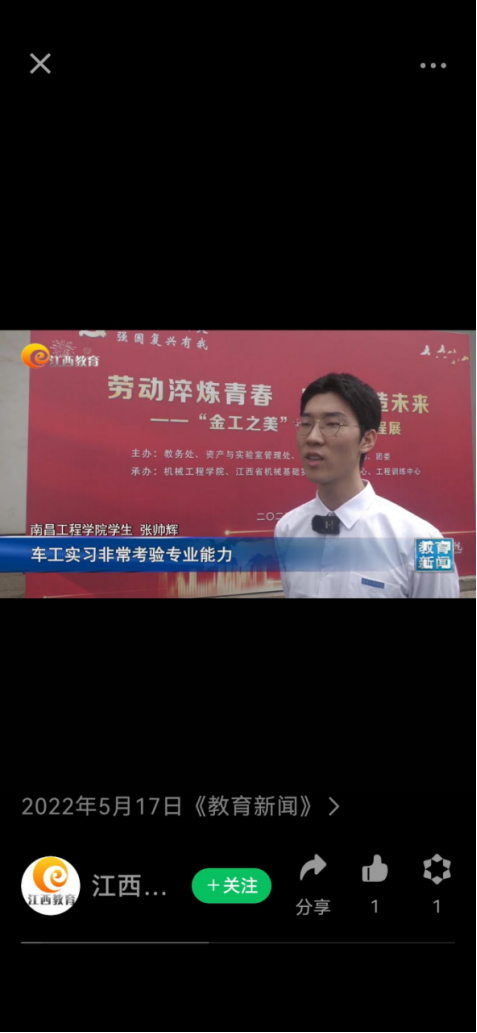 近日,新华社、中新网、人民网、江西教育电视台等主流媒体以《南昌工程学院举办劳动教育课程展》为题,对我校“金工之美”——劳动教育课程展进行报道。
