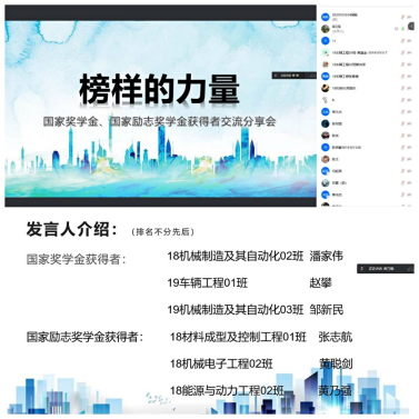 为深入挖掘机械学子中涌现的典型,充分发挥优秀学生的模范带头作用,更好地引导青年学生成长成才,机械工程学院于2022年5月9日至5月10日在线上举办了“榜样的力量—国家奖学金、国家励志奖学金获得者交流分享会活动。