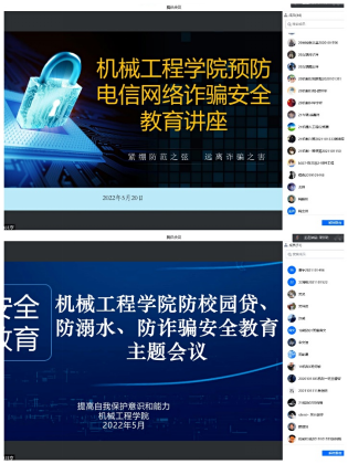 会上,辅导员蔡杨老师线上为学生干部列举了学校近期发生的电信诈骗案例,并针对案例进行分析,通过PPT的演示和防电信诈骗视频的播放,向每位学生展示和介绍了较为常见的电信诈骗形式,结合案例生动再现了诈骗手段,并让学生在会上分享他们在日常生活和学习中所遇到或看到的诈骗现象,切实提高了广大学生的防范意识,并强调暑假来临,同学们注意不要单独私自下水游泳,下水前要活动身体,并且不要到不熟悉或无救援人员的地方游泳。各班再具结合体实际情况采取线上和线下结合的方式对全体机械学子开展安全教育。让学生们对于常见的安全隐患有了更深程度的了解和认识,对于防范意识有了显著提高。