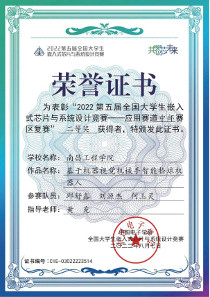 2022年8月7日,第五届(2022)全国大学生嵌入式芯片与系统设计竞赛全国总决赛在南京圆满落幕。本届比赛由东南大学和南京市江北新区管理委员会联合承办,吸引了来自上海交通大学、华中科技大学、电子科技大学、东南大学、南京大学、大连理工大学等411所学校的4717支队伍参赛。我院21级研究生邱舒鑫、刘源杰、何玉灵同学组成的“infinity”团队的参赛作品《基于机器视觉机械手智能拾球机器人》荣获中部赛区复赛二等奖,这是我院学生首次参加该项竞赛并取得优异成绩。