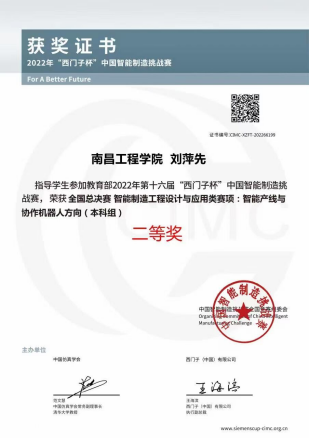 近日教育部2022年第十六届“西门子杯”中国智能制造挑战赛全国总决赛落下帷幕,我院刘萍先老师指导2020级机械电子工程学生陈乐荣获“智能制造工程设计与应用类赛项:智能产线与协作机器人方向(本科组)”全国总决赛二等奖。