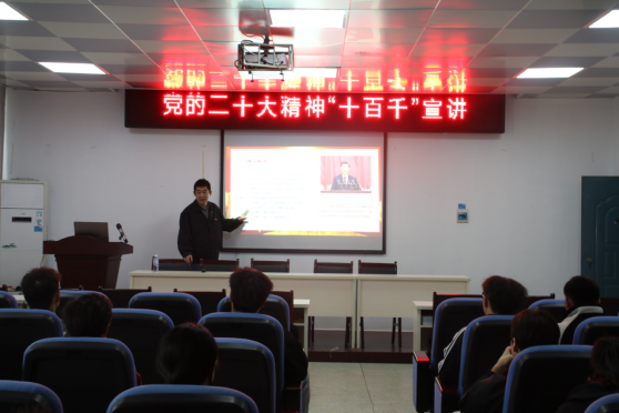 开展“十百千”宣讲。机电楼A304会议室,李培生为联系党支部党员、联系班级学生宣讲党的二十大精神。李培生系统讲解了二十大报告中过去五年的工作和新时代十年的伟大变革、开辟马克思主义中国化时代化新境界、新时代新征程中国共产党的使命任务等十五个方面内容,并要求师生们学习好、宣传好、贯彻好党的二十大精神,坚持学、思、行统一,学思践悟蕴含其中的重要思想、重要观点、重大战略、重大举措,坚定不移听党话、跟党走。