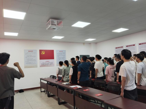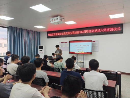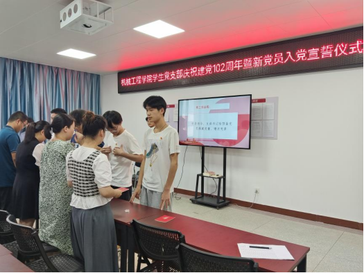 6月19日,机械工程学院学生党支部庆祝建党102周年暨新党员入党宣誓仪式在机电楼A406举行。学院党委负责人、学生党支部书记、老党员代表、新发展预备党员共50余人参加。