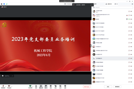 6月17日晚,机械工程学院通过腾讯会议的形式了举行2023年党支部委员业务培训交流会。会议由学院组织员查美云主持,各支部委员共计30余人参加。