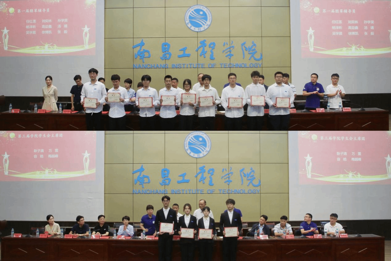 典礼现场,到场领导和嘉宾为60名2023年企业奖学金获奖学子颁奖,并为第一届朋辈辅导员和2023届主席团成员颁发聘书。