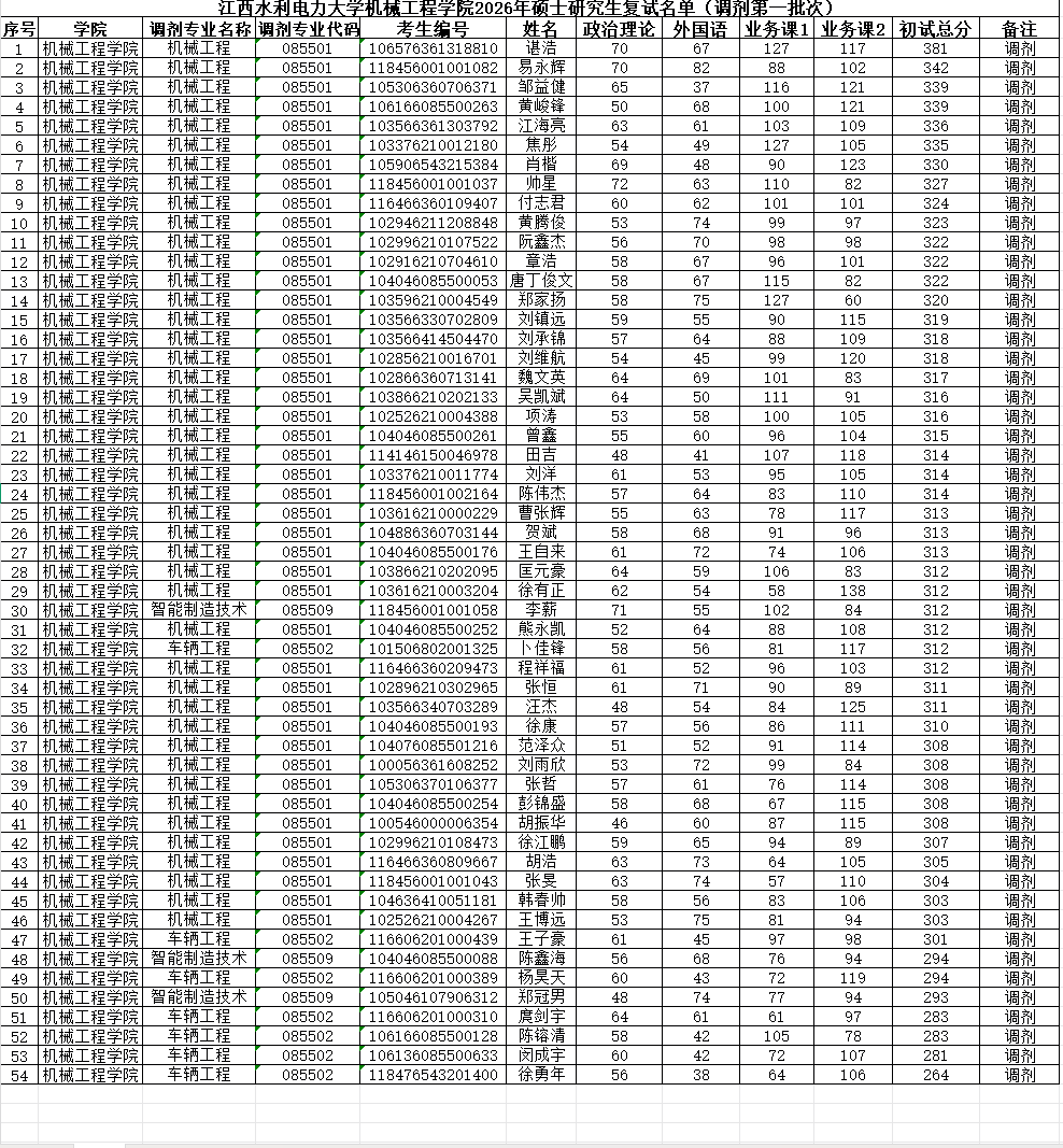 江西水利电力大学机械工程学院2026年硕士研究生复试名单(调剂第一批次)