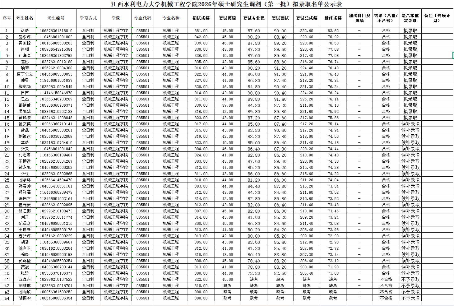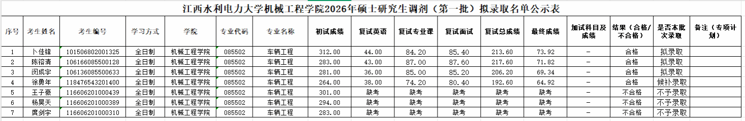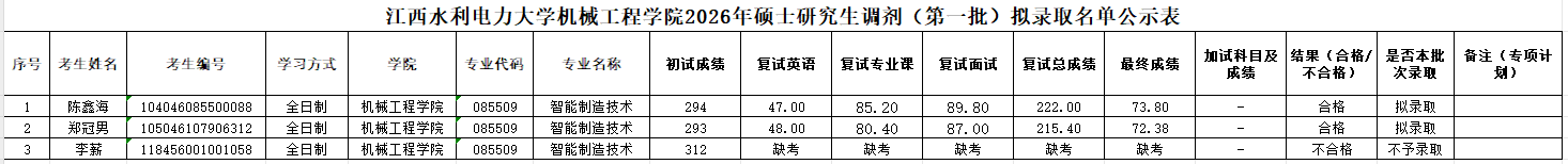 江西水利电力大学机械工程学院2026年硕士研究生调剂(第一批)拟录取名单公示表