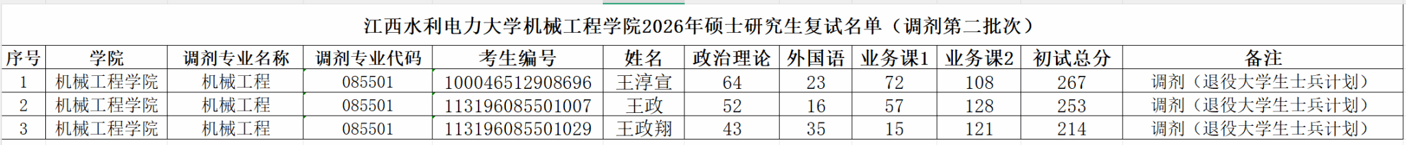 江西水利电力大学机械工程学院2026年硕士研究生复试名单(调剂第二批次)