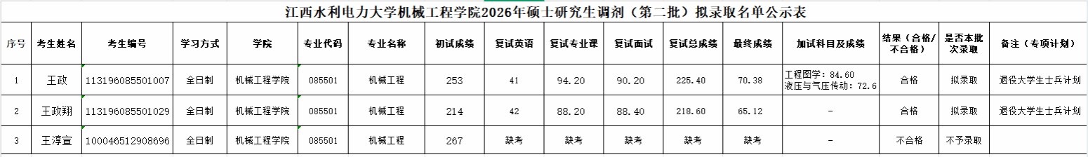 江西水利电力大学机械工程学院2026年硕士研究生调剂(第二批)拟录取名单公示表