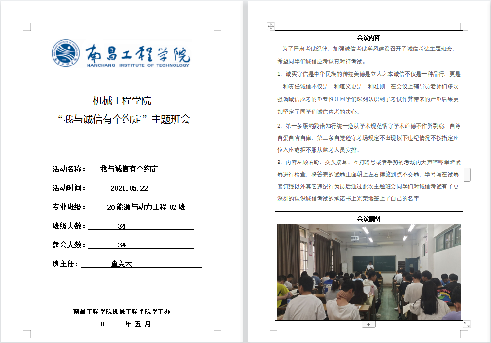 各班级组织召开诚信考试教育主题班会“我与诚信有个约定”,班级负责人向所在班级学生强调在考试期间要以严要求规范自身,端正学风、严肃考纪、诚信考试,杜绝考试违纪与作弊行为。同时,各班级学生需签下《机械工程学院诚信及假期安全承诺书》,郑重作出遵守考试纪律、诚信完成考试的承诺。
