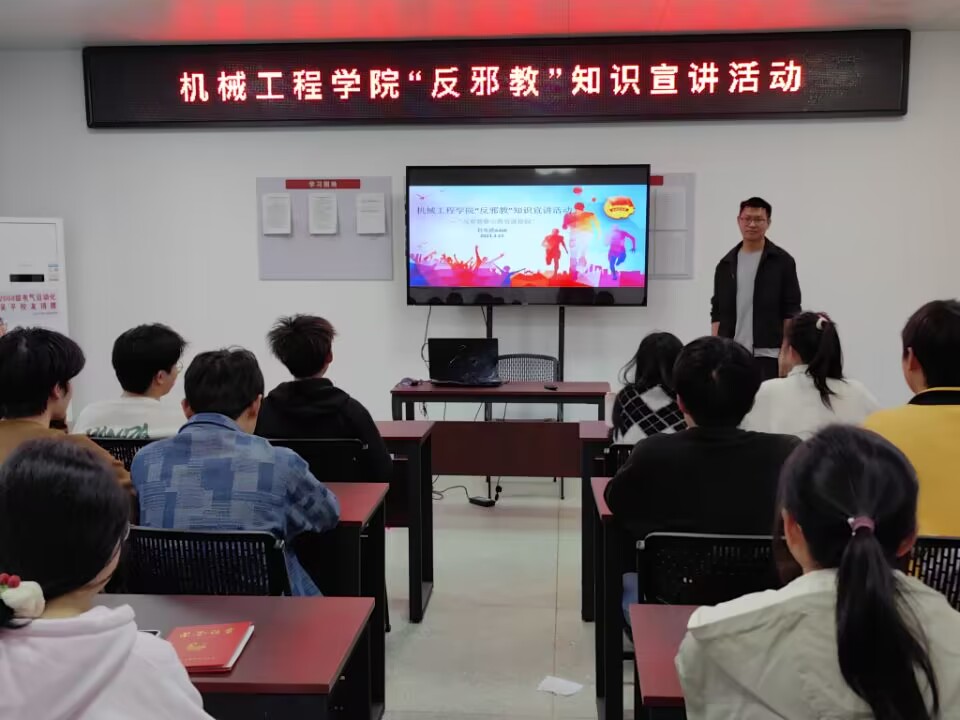 3月16日,机械工程学院在机电楼406开展了反邪教知识宣讲活动,主讲人主要由学院团委学生会各部门负责人组成,精心布置,各年级专业班级班长参加。