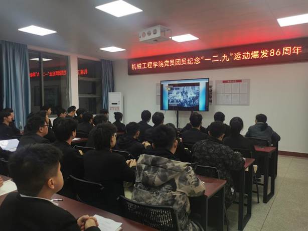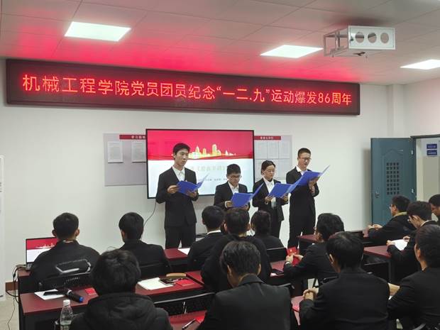 12月9日晚,机械工程学院在机电楼A406党员活动室举行了纪念“一二.九”运动86周年纪念活动暨新党员入党宣誓仪式,40余名新发展的学生党员参加活动,部分团员代表观摩。