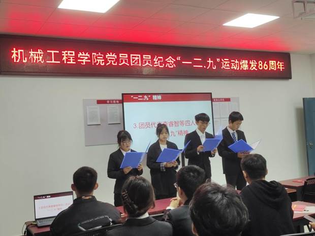 纪念活动中,党员团员们集体观看视频了《抗战史上的今天——一二.九》。新发展党员代表们朗诵诗歌《碧血丰碑》,朗诵慷慨激昂、震撼人心,仿佛带领大家又回到了1935年那个凛冽冬季。到场团员们宣讲“一二.九”精神,他们代表全体团员做出承诺,热爱祖国,不负青春,自强不息,矢志不渝。